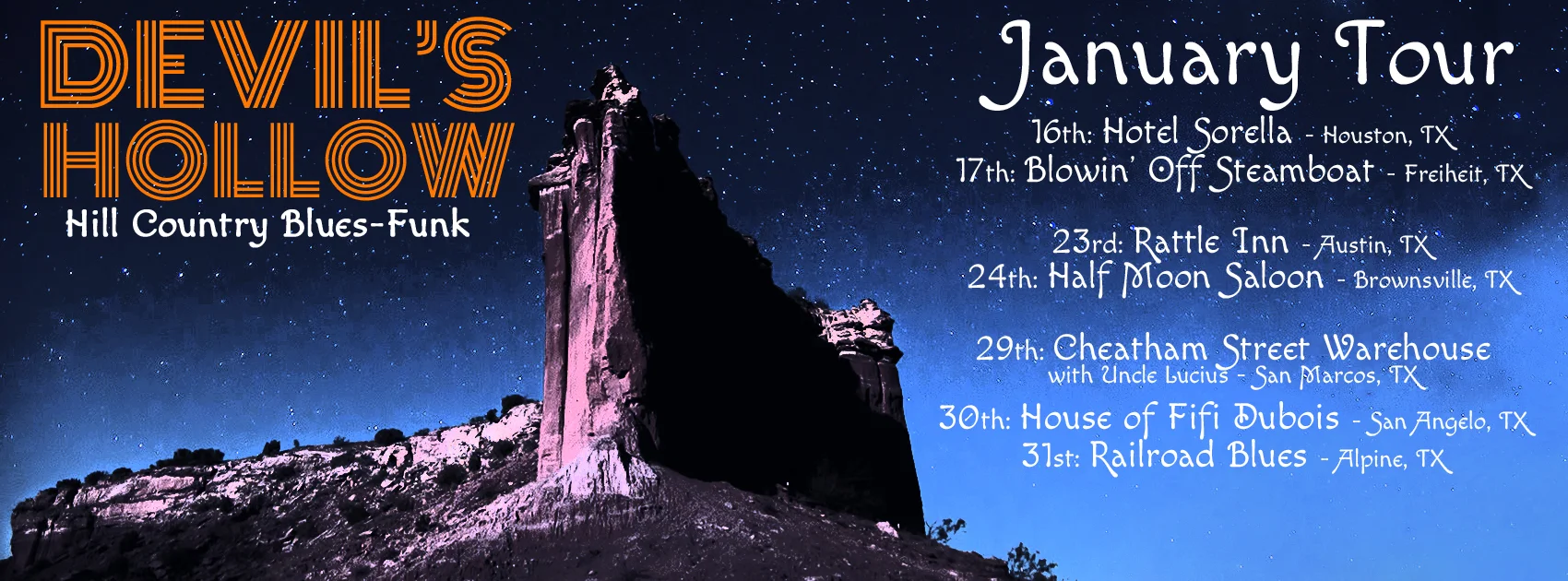 The last weekend of January is a big one, with Devil's Hollow teaming up with roots-rockers Uncle Lucius at Cheatham Street (Jan. 29th) before departing on a West Texas weekend; their first appearance at San Angelo's House of Fifi Dubois (Jan. 30th) and a highly-anticipated return to Railroad Blues in Alpine on January 31st.